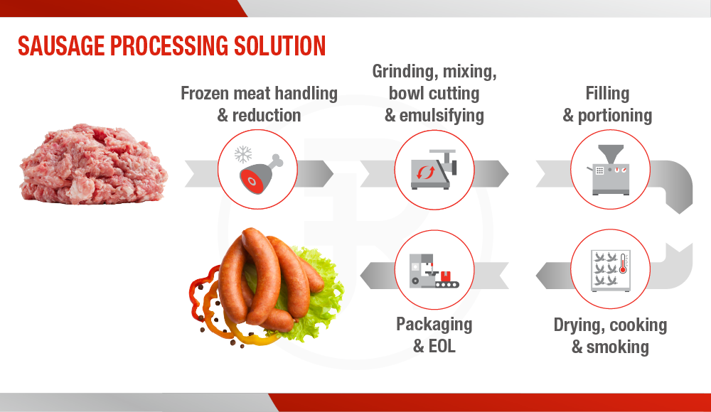Processing lines for processed and value-added meat such as sausages, nuggets, patties, and minced meat rely on precise control of mixing, emulsification, and thermal treatment processes. We support you in selecting the right processing technologies to achieve stable texture formation, controlled fat and protein integration,