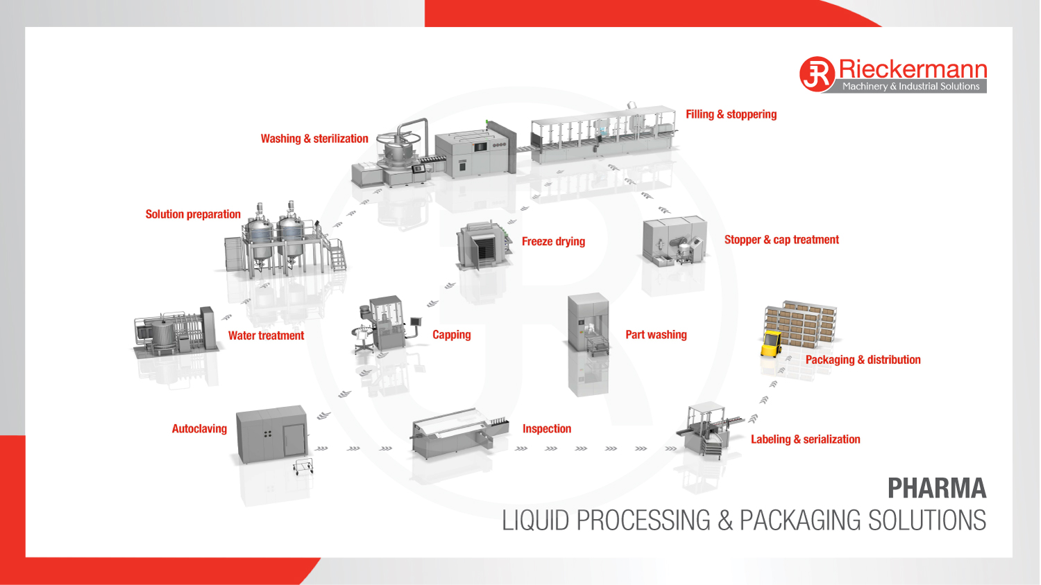 Rieckermann’s liquid processing and packaging solutions include equipment for the whole range of processes – from the production of pharmaceutical liquids through to downstream, including primary packaging, such as the filling and closing of containers, and secondary packaging.
